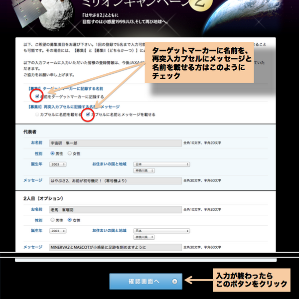 「はやぶさ知ったの帰還後だから載せられなかったよ」という方、今度は一緒に飛びましょう!応募フォームはこちら hayabusa2.org/form/ です。 今回は再突入カプセルにも名前や寄せ書きが刻めます!小惑星に見に行くのは大変ですがカプセルならば7年後に見られますヨ(兄